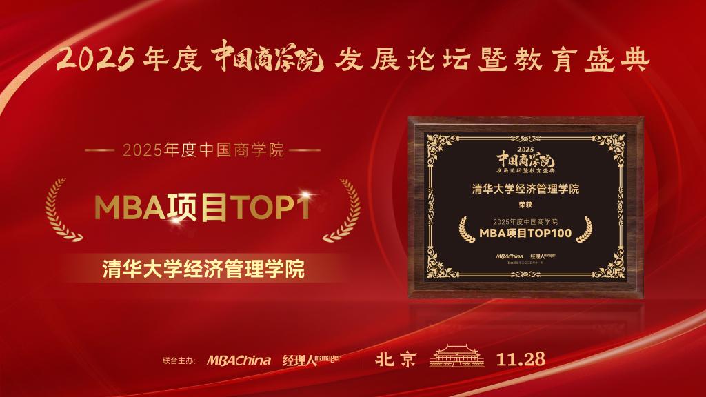 11月28日,“2025年度中国商学院发展论坛暨教育盛典”在北京召开,MBAChina与《经理人》杂志发布“2025年度中国商学院MBA项目TOP100榜单”,清华大学经济管理学院荣膺第1名。