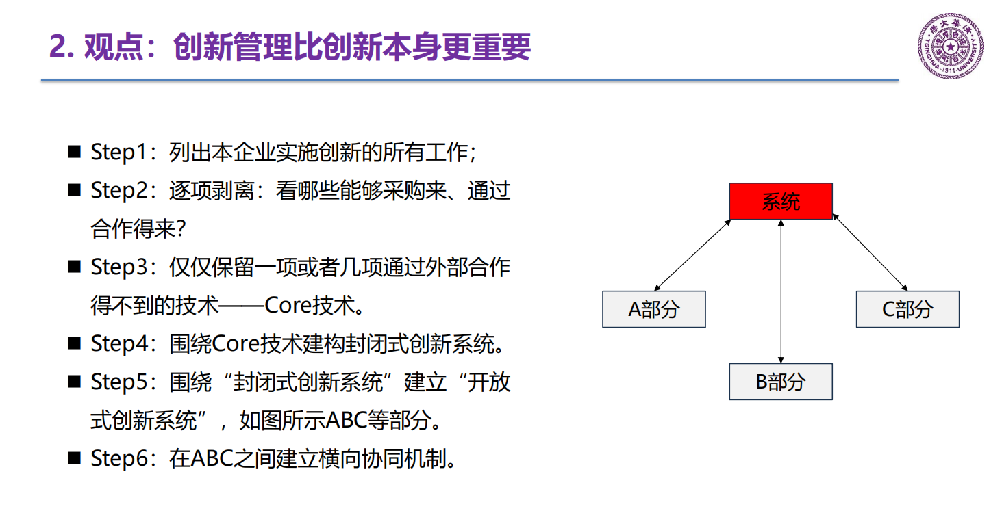 实操层面,赵学长提出两点核心:一是技术变现靠创新管理系统(管理价值命题、价值链等);二是开放式创新中,创新管理比创新本身更重要,并给出六步法(罗列创新工作、剥离可合作获取部分、保留核心技术、建封闭系统、建开放系统、设横向协同),还以汽车公司为例说明。针对中小企业,他提供简易框架,助力企业链接 C/B/G/K/S 端利益相关方开展合作。