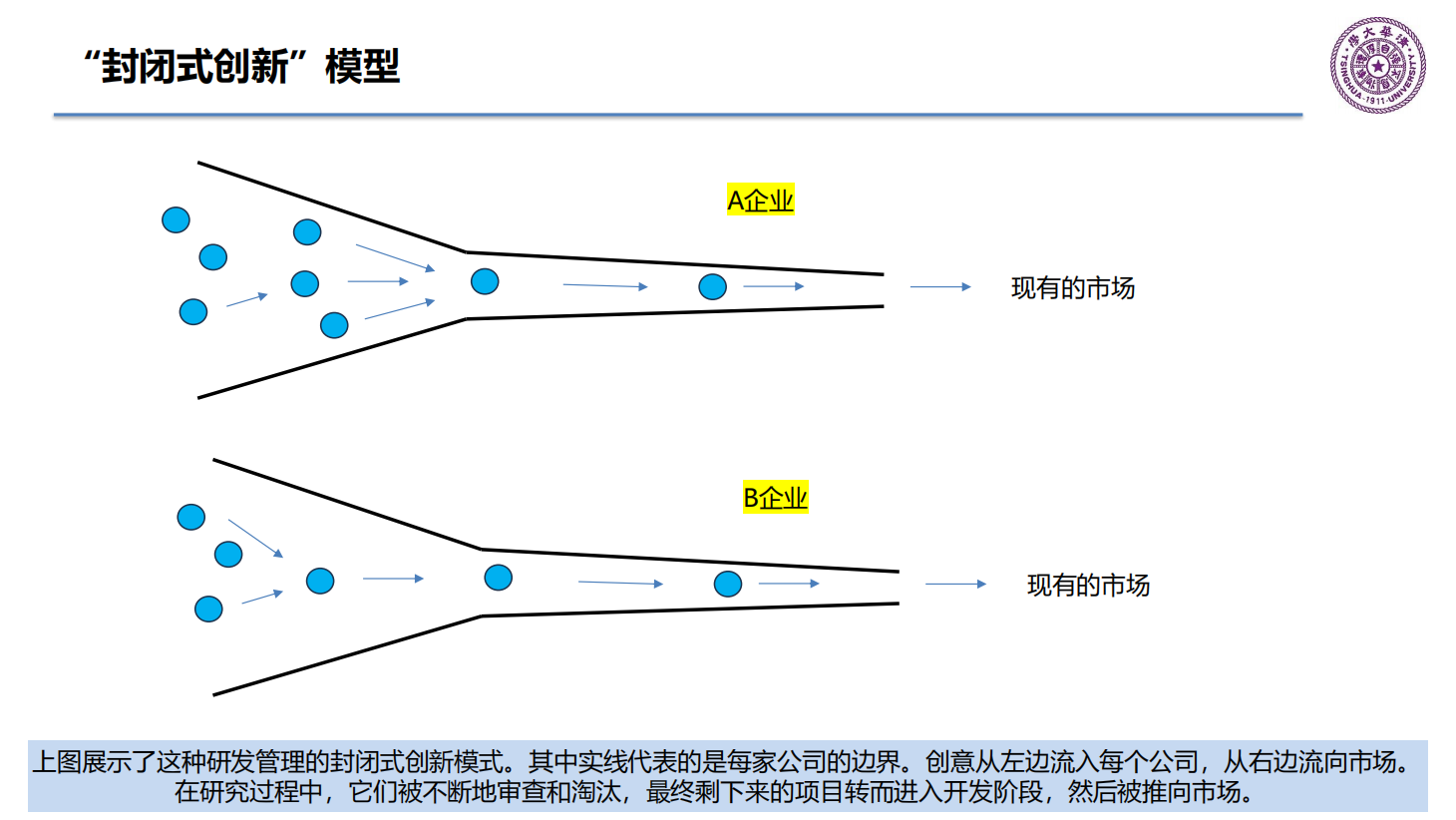 关于封闭式创新,赵学长指出 20 世纪早期企业创新如 “戒备森严的城堡”,贝尔实验室、GE 实验室等研发中心自给自足,创新闭环于内部。其模型中,创意从流入到推向市场全在企业内,依赖内部研发发展。后因内部研发与开发矛盾凸显、成果搁置,叠加人才流动与风险资本推动,搁置成果外流,封闭式创新崩塌。以施乐为例,其固化思维使其难改模式,人才技术外溢造成双重损失。